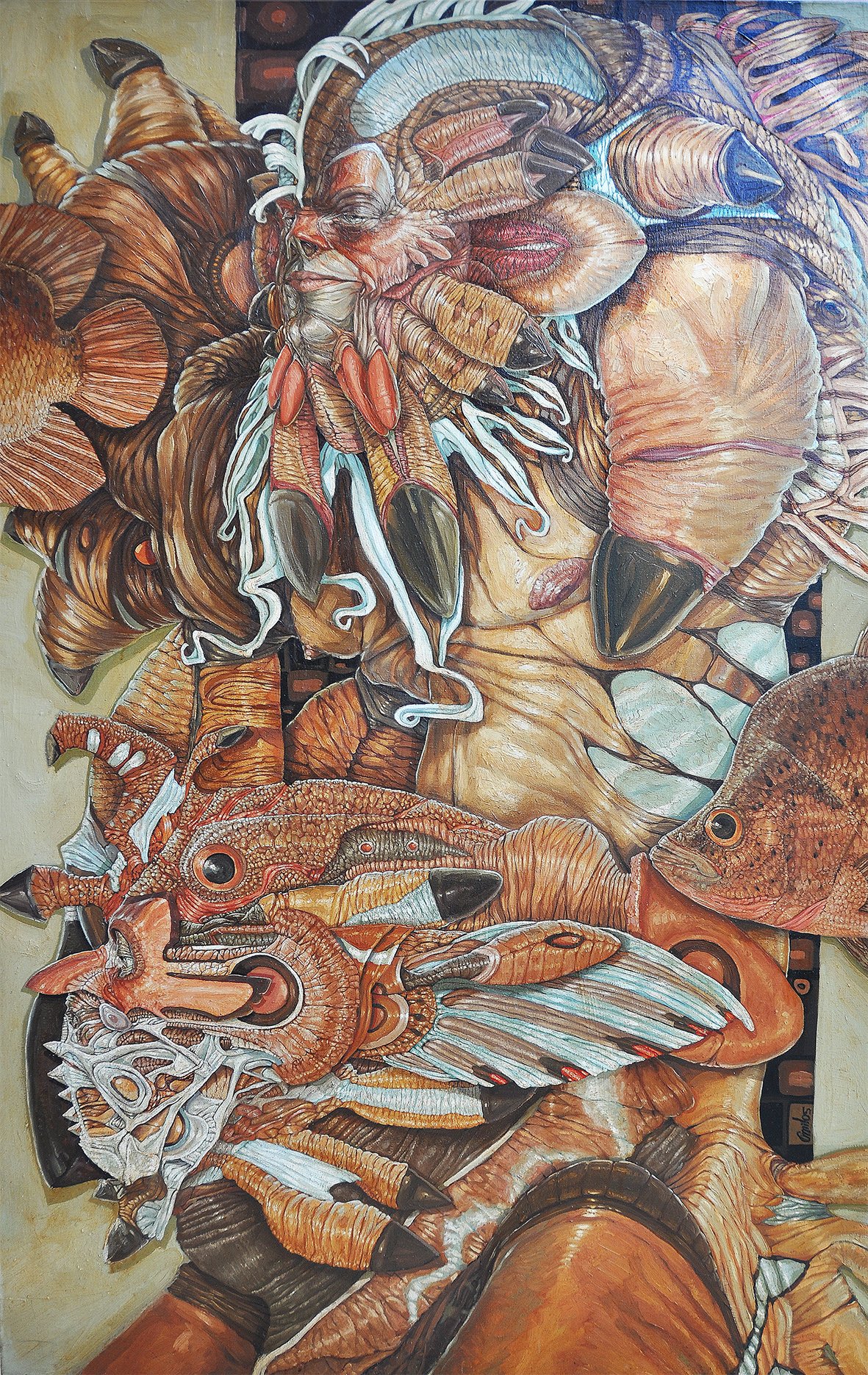 Dycon II presents one of the most architecturally complex organisms in Yctyogenesis—an entity built around layered protection and adaptive camouflage. Its body is composed of overlapping plates, chitinous ridges, and horn-like extensions that resemble both deep-sea armor and terrestrial carapaces. The creature’s anatomical clusters interlock like a living fortress, creating a form that is simultaneously impenetrable and highly engineered.