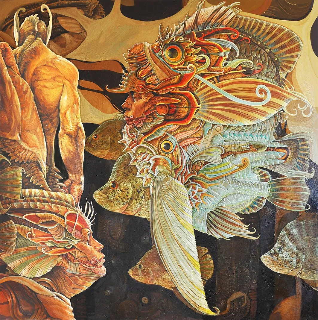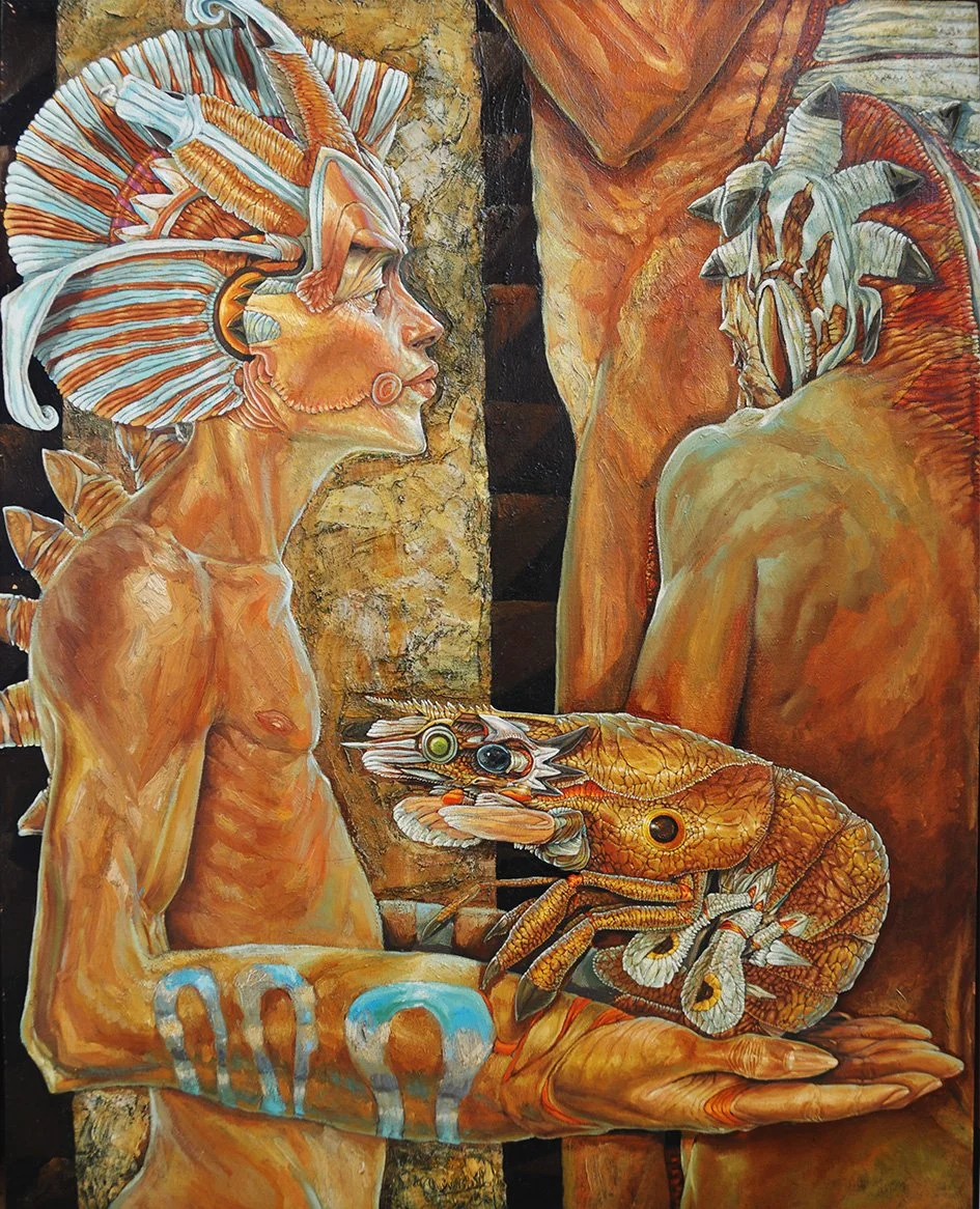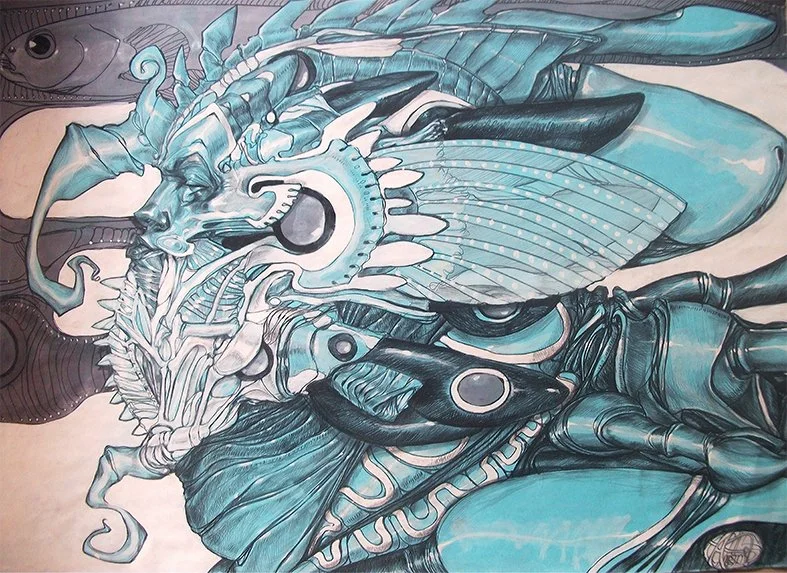 These hybrid organisms emerge entirely from Aurelio Milera’s imagination, drawn without models or visual references. They embody the tension between human intelligence and its tendency toward self-destruction.