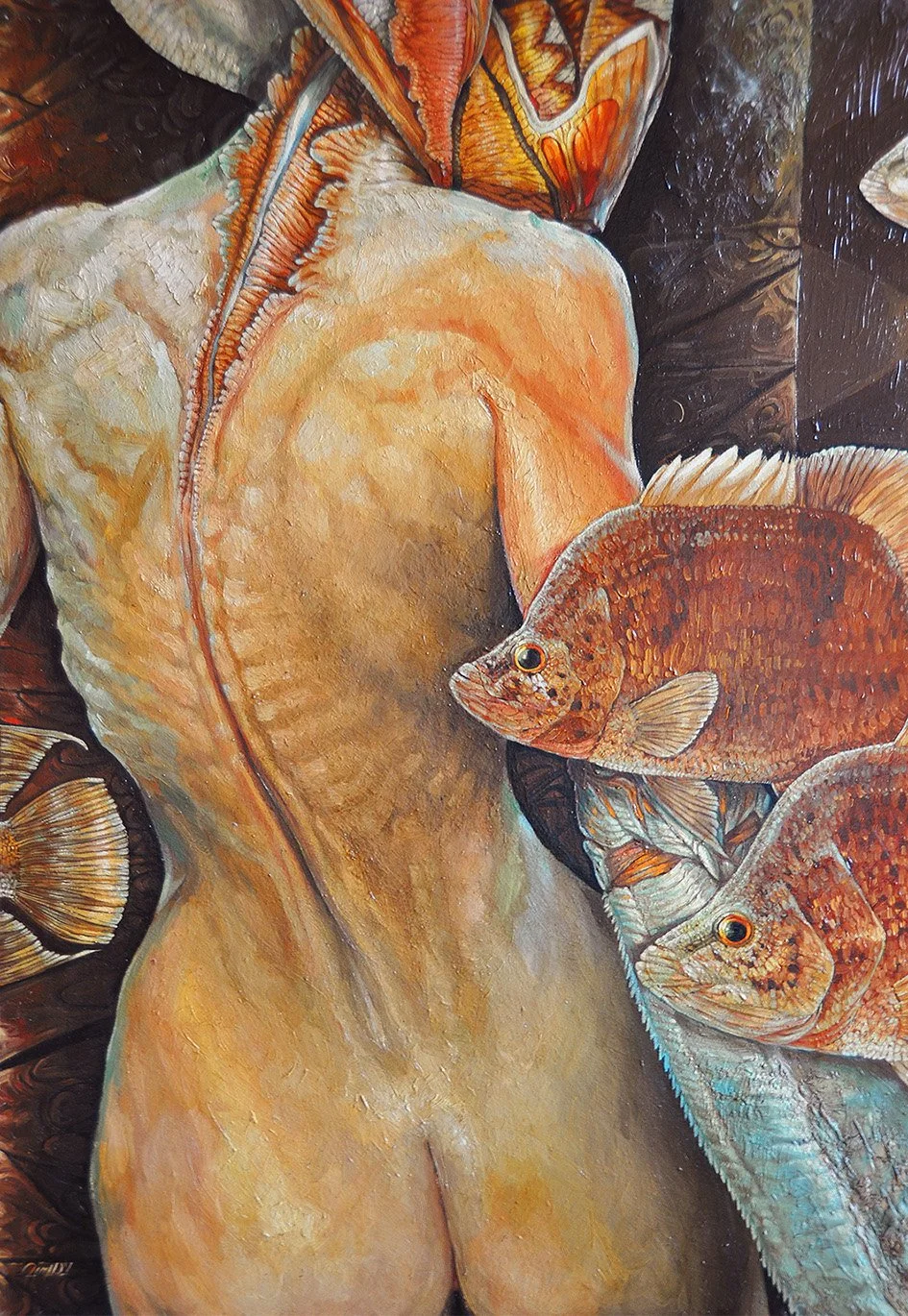 Mermaids II explores the tension between vulnerability and metamorphosis within the Yctyogenesis universe. The exposed human back — rendered with Aurelio Milera’s characteristic sensitivity to anatomy — evokes fragility, intimacy, and the beauty of the human form. Around it, scales, fins, and hybrid aquatic structures merge seamlessly with flesh, transforming the figure into something both familiar and biologically impossible.