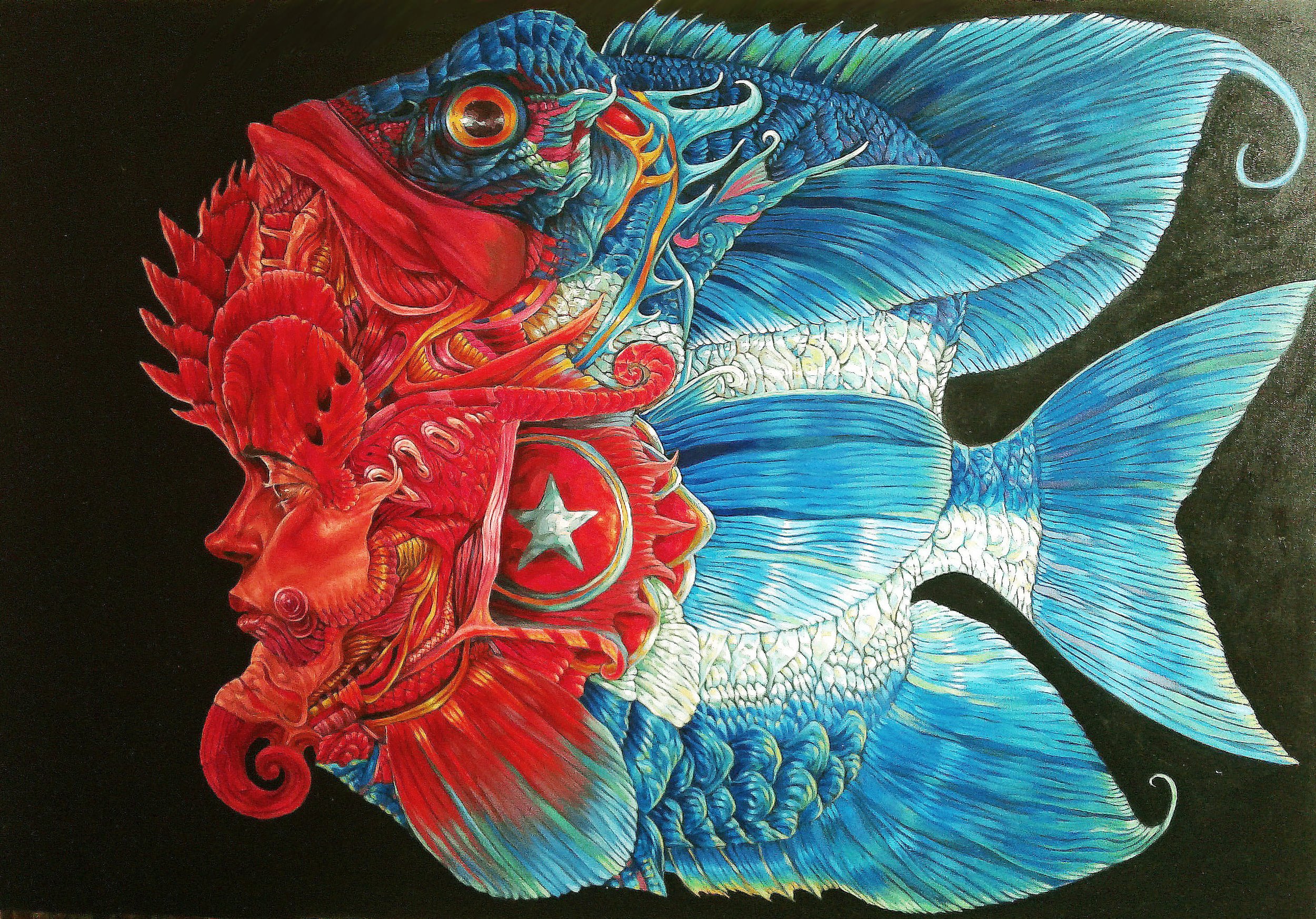 Its layered faces, endemic marine forms, and vibrant palette evoke a being that carries an entire ecosystem within itself. Forward-facing and charged with momentum, the figure suggests adaptation, hope, and the instinctive pull toward new horizons. Within the mythology of Yctyogenesis, Universal Migrator represents evolution in motion—the moment a guardian becomes a traveler.